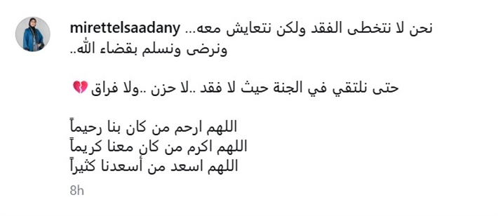 صلاح السعدني وابنته ميريتوكتبت ميريت السعدني: " نحن لا نتخطى الفقد ولكن نتعايش معه… ونرضى ونسلم بقضاء الله.. حتى نلتقي في الجنة حيث لا فقد ..لا حزن ..ولا فراق اللهم ارحم من كان بنا رحيما، اللهم أكرم من كان معنا كريما اللهم اسعد من أسعدنا كثيرا".