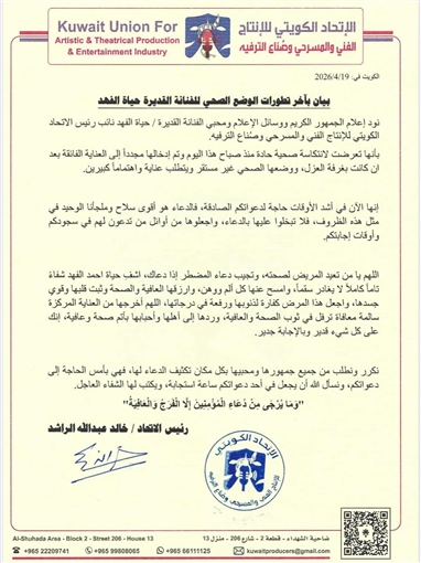 بيان الاتحاد الكويتي للإنتاج الفني والمسرحيواختتم البيان: "نكرر ونطلب من جميع جمهورها ومحبيها بكل مكان تكثيف الدعاء لها، فهي بأمس الحاجة إلى دعواتكم، ونسأل الله أن يجعل في أحد دعواتكم ساعة استجابة، ويكتب لها الشفاء العاجل. "وَمَا يُرْجَى مِنْ دُعَاءِ الْمُؤْمِنِينَ إِلَّا الْفَرَجُ وَالْعَافِيَةُ"رئيس الاتحاد الكويتي للانتاج الفني والمسرحي / خالد عبدالله الراشد".