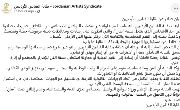 السيلاويأما نقابة الفنانين الأردنيين أصدرت بيانا عبر حسابها على Facebook أكدت فيه أن السيلاوي ليس عضوا بها ووصفته بـ "منتحل صفة".