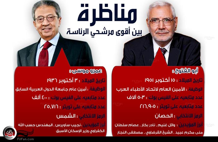 المناظرة الرئاسية التاريخية تجمع بين الثنائي المرشح للرئاسة الدكتور عبد المنعم أبو الفتوح والسيد عمرو موسى.