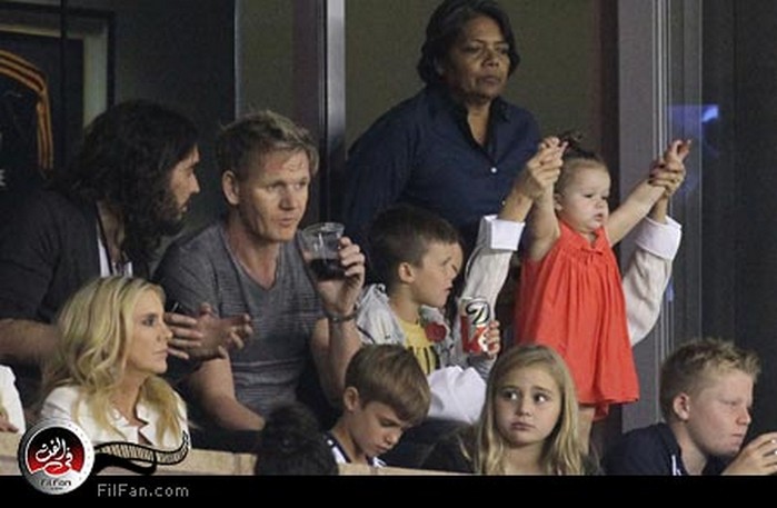 وحضر المباراة أيضا بجوار زوجة بيكام وأبنائهما الشيف الشهير جوردون رامزي والنجم راسل براند لذي بدت الصغيرة هاربر مهتمة بشعره الملتف أكثر من وسامته.