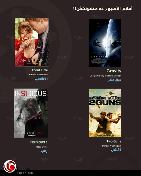 لهواة متابعة الأفلام الأجنبية فور طرحها بدور العرض، موعدكم هذا الأسبوع مع فيلم ساندرا بولوك وجورج كلوني في فيلم " Gravity" الذي نال إعجاب الجمهور والنقاد في نفس الوقت، هذا بالإضافة إلى غيره من الأفلام مثل "2 Guns" لدينزيل واشنطن وفيلم الرعب "Insidious 2" و"About Time".