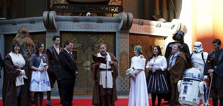 وقاد معجب آخر بالسلسلة، ارتدى زي دارث فيدر (الشخصية الشريرة الرئيسية في سلسلة الأفلام)، كارولين على الممشى بينما لعب عازف كمان لحن الموسيقى التصويرية الشهيرة لحرب النجوم، ثم تبادل الزوجان نذور الزواج. ويعتزم الزوجان الاحتفال بحضور عرض الفيلم.