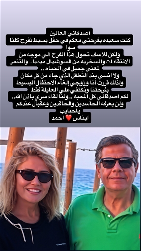 إيناس الدغيدي وزوجهاوأضافت إيناس الدغيدي: "ولذلك قررت أنا وزوجي إلغاء الاحتفال البسيط بفرحتنا ونكتفي على العائلة فقط، لكم أصدقائي كل المحبة، ولنا لقاء سري بإذن الله، ولن يعرفه الحاسدون والحاقدون وعقبال عندكم يا حبايب"
