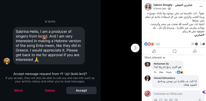 كشفت الفنانة صابرين النجيلي عن رفضها لعرضا لسرائيليا لتحويل أغنيتها "إنت مين" للعبرية.