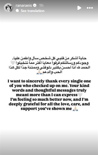 وكتبت رنا رئيس عبر حسابها بموقع Facebook: "حابة أشكر من قلبي كل شخص سأل وأطمن عليا، وجودكم ورسائلكم فرقوا معايا أكتر مما تتخيلوا، الحمدلله أنا أحسن بكتير دلوقتي، وممتنة جدا لكل هذا الحب والدعم".