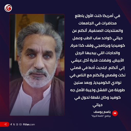 وقال باسم يوسف خلال لقائه مع الإعلامي أحمد سالم في برنامج "كلمة أخيرة" المذاع عبر قناة ON: "في أمريكا كنت الأول باطلع محاضرات في الجامعات والمنتديات الصحفية، أتكلم عن حياتي كواحد ساب الطب وعمل كوميديا وبرنامجي وقف كذا مرة، والحاجات اللي بيحبها الرجل الأبيض، وفضلت فترة أكل عيشي إني أتكلم. ابتديت أحط في قصتي نكت وقصص وأتكلم مع الناس في نوادي الكوميديا، وبعد سنين طويلة من الفشل وخيبة الأمل جه كوفيد وكان نقطة تحول في حياتي".