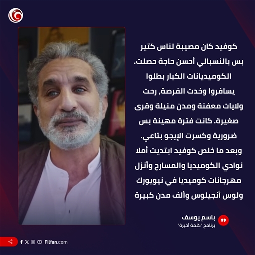 لقاء باسم يوسف في كلمة أخيرةأوضح باسم يوسف تأثير الجائحة على مسيرته في تقديم العروض الكوميدية بأمريكا قائلا: "كوفيد كان مصيبة لناس كتير بس بالنسبالي أحسن حاجة حصلت. الكوميديانات الكبار بطلوا يسافروا وخدت الفرصة، رحت ولايات معفنة ومدن منيلة وقرى صغيرة. كانت فترة مهينة بس ضرورية وكسرت الإيجو بتاعي. وبعد ما خلص كوفيد ابتديت أملا نوادي الكوميديا والمسارح وأنزل مهرجانات كوميديا في نيويورك ولوس أنجيلوس وألف مدن كبيرة".