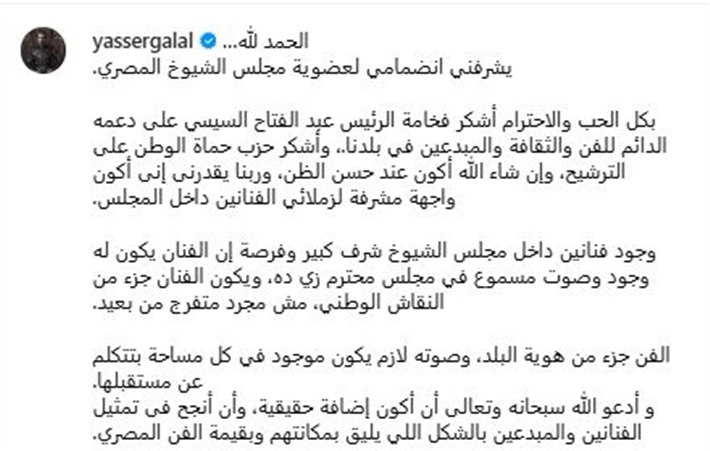 عبر الفنان ياسر جلال عن فخره بعد تعيينه في مجلس الشيوخ.
