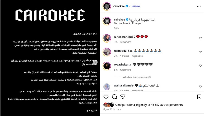 وجاء في بيان من الفريق عبر حسابه الرسمي عبر تطبيق Instagram: "إلى جمهورنا العزيز، بسبب حالات الوفاة داخل عائلة كايروكي، نعلن بكل أسف تأجيل جولتنا الأوروبية في مثل هذه الأوقات، تأتي العائلة أولًا، ونحن بحاجة إلى بعض الوقت للوقوف إلى جانب بعضنا البعض ونتجاوز هذه المرحلة الصعبة معًا".