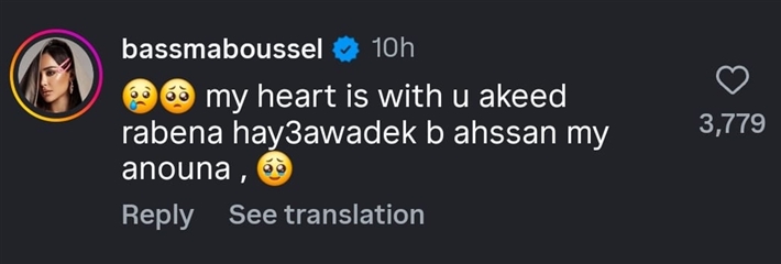وكتبت بسمة بوسيل تعليقا على منشور آن حول طلاقها: "قلبي معاكي، أكيد ربنا هيعوضك بالأحسن".