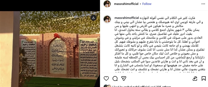 وتابعت ماس محمد رحيم: "أنا بقيت أدور عليك في تفاصيل عمري ما كنت باخد بالي منها في العادي، بدور على صوتك في كلامي وملامحك في مرايتي وفي وشوش إخواتي وأهلنا، كل ما بتوحشني يا بابا بتفرج عليهم وبشوفك فيهم. كل كلامك يهمني وأي حاجة كانت بتيجي في بالك ولو ثانية كانت بتشغل تفكيري ويمكن عشان كدا أنا مش بنسى، أنا كنت بشوف حركاتك وتعبيراتك ومش بعيوني وخلاص انت ليك مكان خاص جوا قلبي".