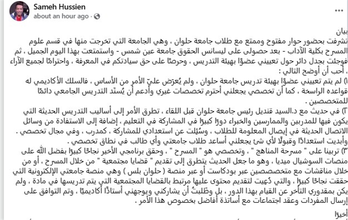 وأصدر سامح حسين بيانا جاء فيه: "تشرفت بحضور حوار مفتوح وممتع مع طلاب جامعة حلوان ، وهي الجامعة التي تخرجت منها في قسم علوم المسرح بكلية الآداب - بعد حصولى على ليسانس الحقوق جامعة عين شمس - واستمتعت بهذا اليوم الجميل ، ثم فوجئت بجدل دائر حول تعييني عضوا بهيئة التدريس ، وحرصا على حق سيادتكم في المعرفة ، واحتراما لجميع الآراء ، أحب أن أوضح التالي: