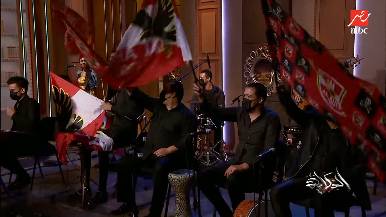فرقة عمر كمال تفاجئ عمرو أديب بأعلام الأهلي